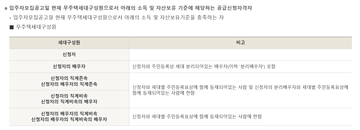 입주자 모집 공고일 현재 무주택 세대 구성원으로서 소득 및 자산보유 기준을 만족하는 사람이어야 합니다.